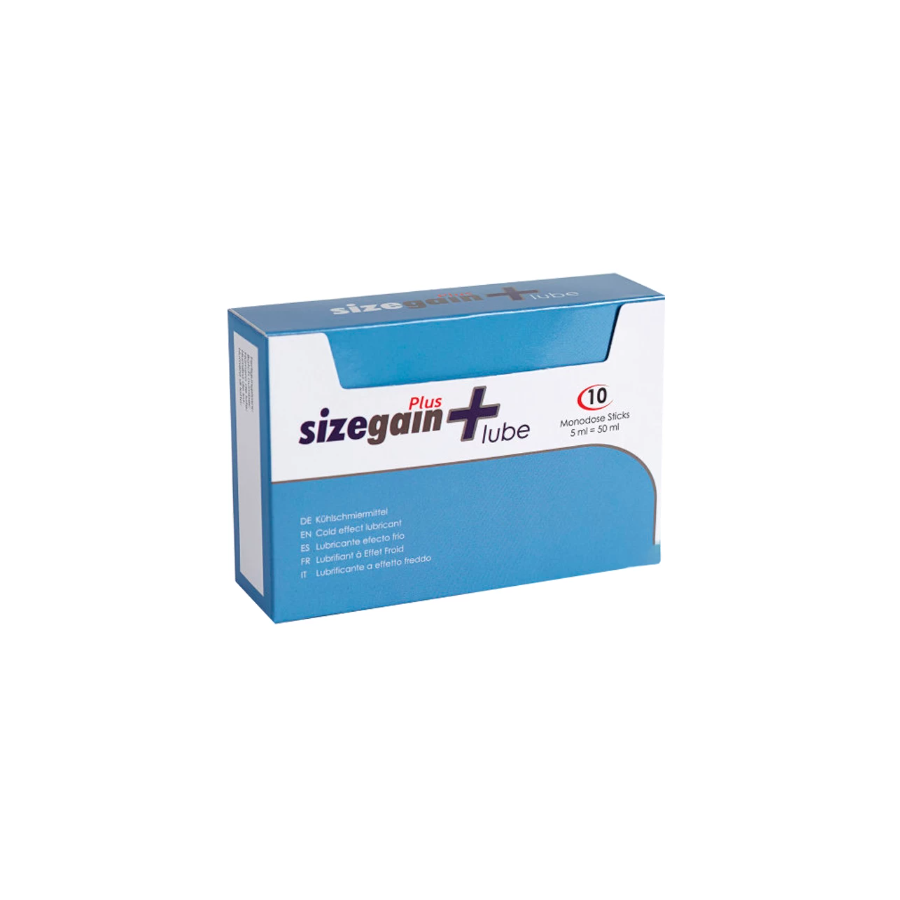 Sizegain Plus Lube é um lubrificante íntimo de efeito frio à base de água. Atua como revigorante e maximiza o prazer graças ao seu grande poder lubrificante. Vêm em embalagens de 10 saquetas unidose de 5 ml cada. Leve para onde quiser, super discreto e muito higiênico. Aplique no pênis para começar a desfrutar.
