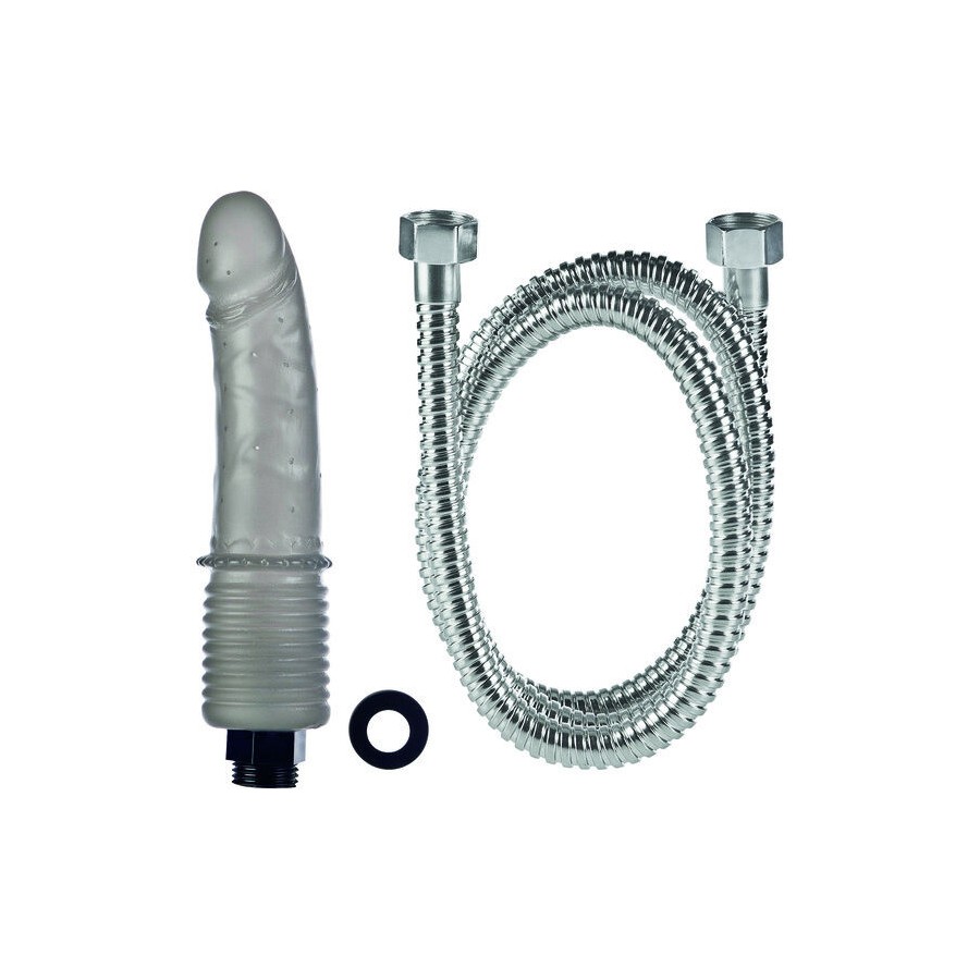 Vibrador de limpeza para banho em forma de pênis, feito de gelatina, com dezenas de pequenos orifícios por onde sai a água pressurizada.