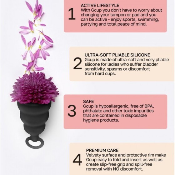 O copo menstrual Gcup tem formato de sino. A principal vantagem do Gcup é a válvula de retenção interna. Graças à válvula, o fluido não retorna à vagina durante um estilo de vida ativo. Você pode fazer suas atividades diárias, praticar esportes e até nadar, esquecendo-se completamente dos “dias de hoje”. O Gcup tem uma superfície macia e lisa, com o tamanho perfeito para você não passar vontade. Além disso, as tigelas economizarão uma quantia significativa em comparação com absorventes e tampões convencionais. O copo menstrual Gcup é absolutamente seguro para a saúde da mulher.