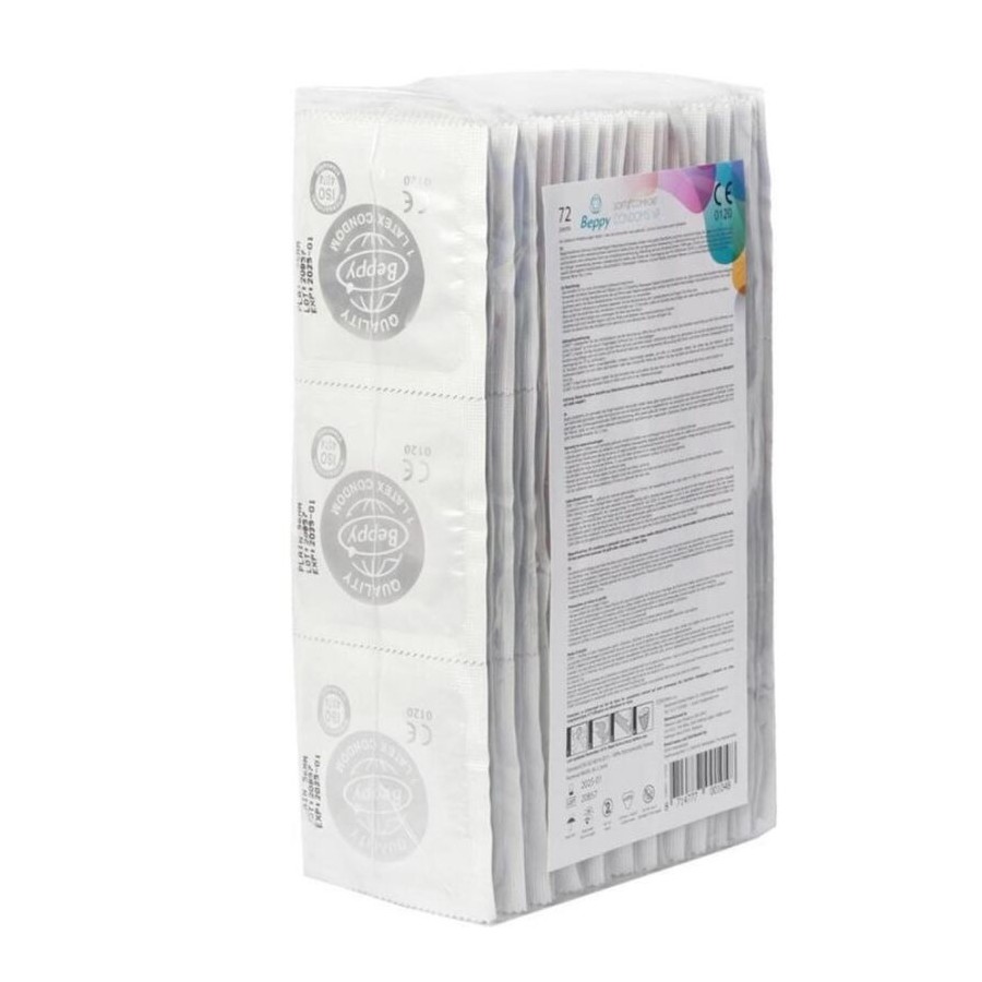 Os preservativos Beppy são ligeiramente maiores do que os preservativos normais e não têm odor desagradável de látex. Os preservativos Beppy são feitos de látex de borracha natural e oferecem excelente proteção. Eles são fornecidos com um reservatório e contêm um lubrificante de silicone não espermicida.