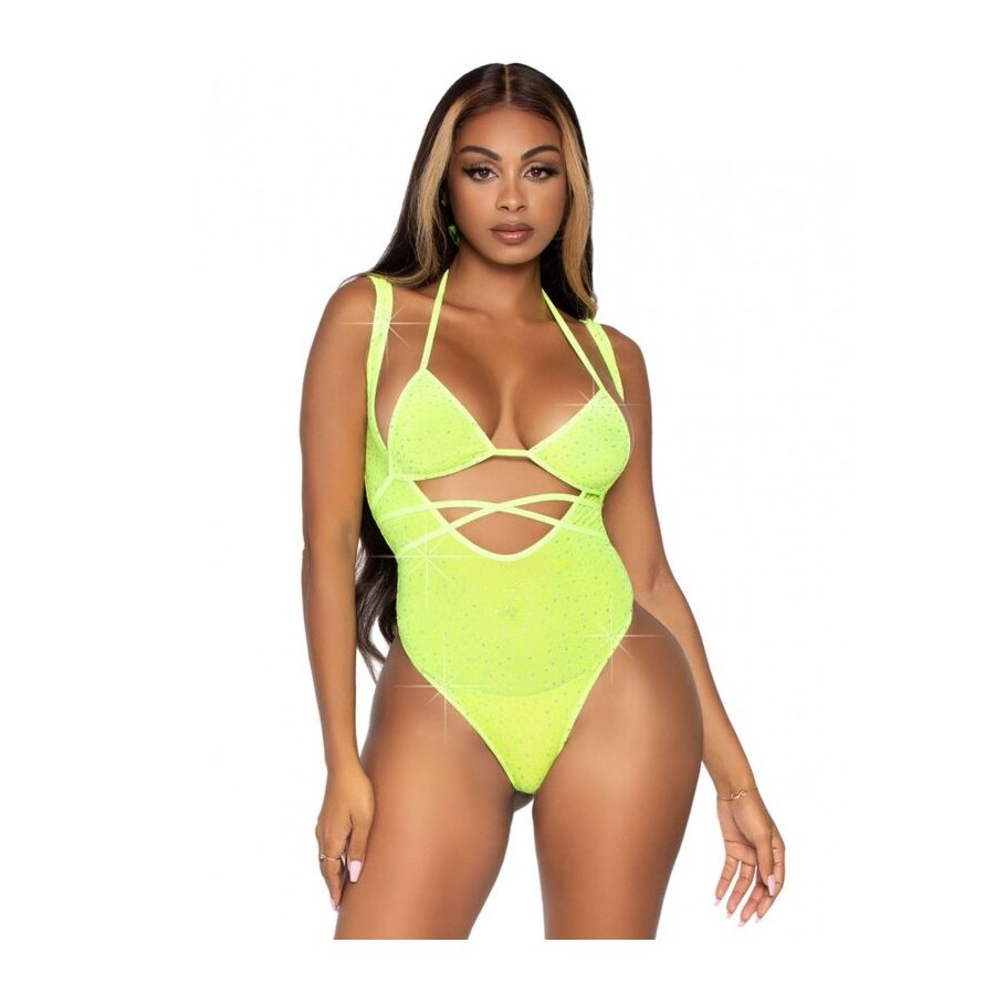 Top de biquíni e body com suspensório em malha de strass fabricado pela prestigiada marca de lingerie Leg Avenue. Aumente a sua feminilidade obtendo uma peça exclusiva de sedução, sensualidade e elegância.