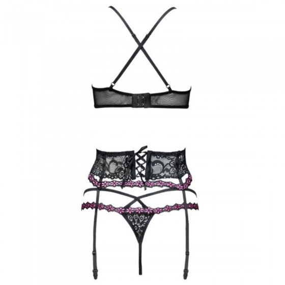 Um conjunto de lingerie exclusivo e elegante feito de renda preta intrincada. Um sutiã sedutor com alças finas que se cruzam nas costas, decorado com alças e joias de prata. Elegante cinta-liga amarrada nas costas com fita de cetim. Uma decoração adicional são duas fitas de flores rosa. O conjunto inclui uma tentadora tanga com um pequeno coração prateado.