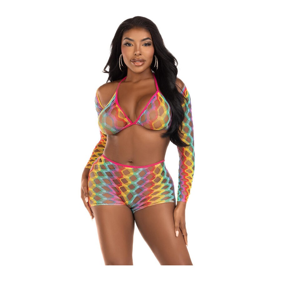 O conjunto de três peças de top com sutiã, bolero e shorts em mesh na cor arco-íris é uma explosão de estilo e diversão. Projetado para quem quer se destacar e expressar sua personalidade vibrante, este conjunto é uma ousada declaração de moda e originalidade.
