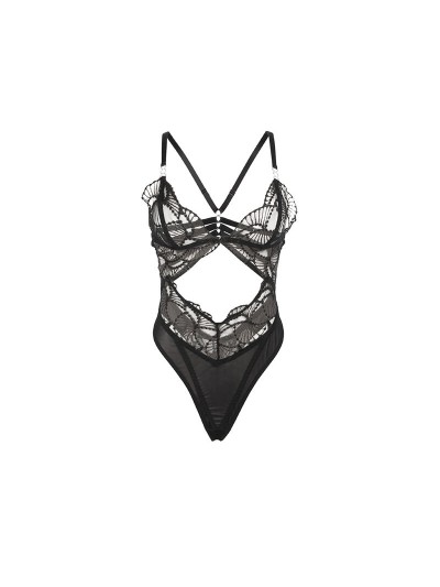 O design incorpora detalhes de renda transparente que acrescentam um toque de delicadeza e requinte, enquanto os cortes estratégicos hollow cut realçam a silhueta, revelando a pele de forma sutil e sedutora. A combinação de renda e preto, clássico e atemporal, acrescenta um ar de mistério e sofisticação que não passará despercebido.