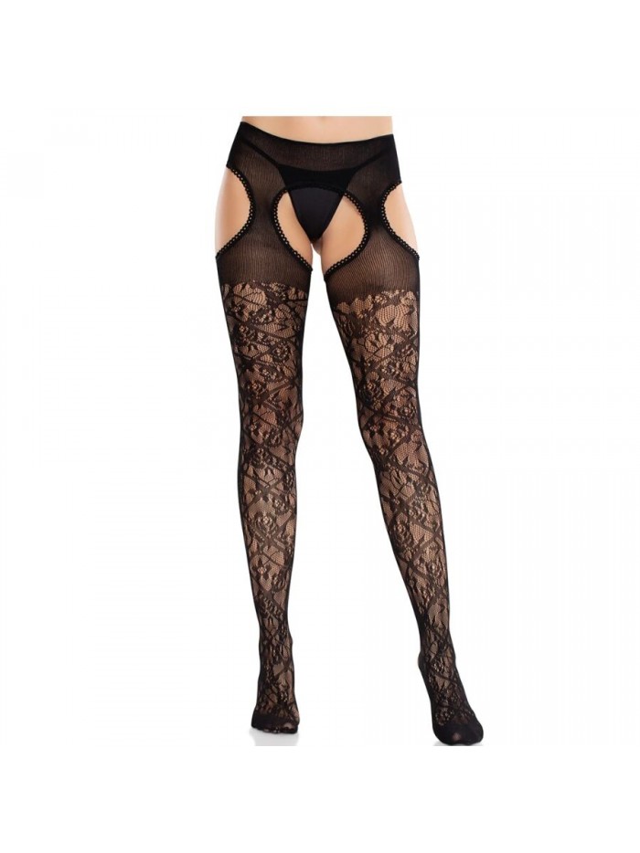 LEG AVENUE - FLORAL LACE STOCKINGS WITH GARTERS UNITED BLACK