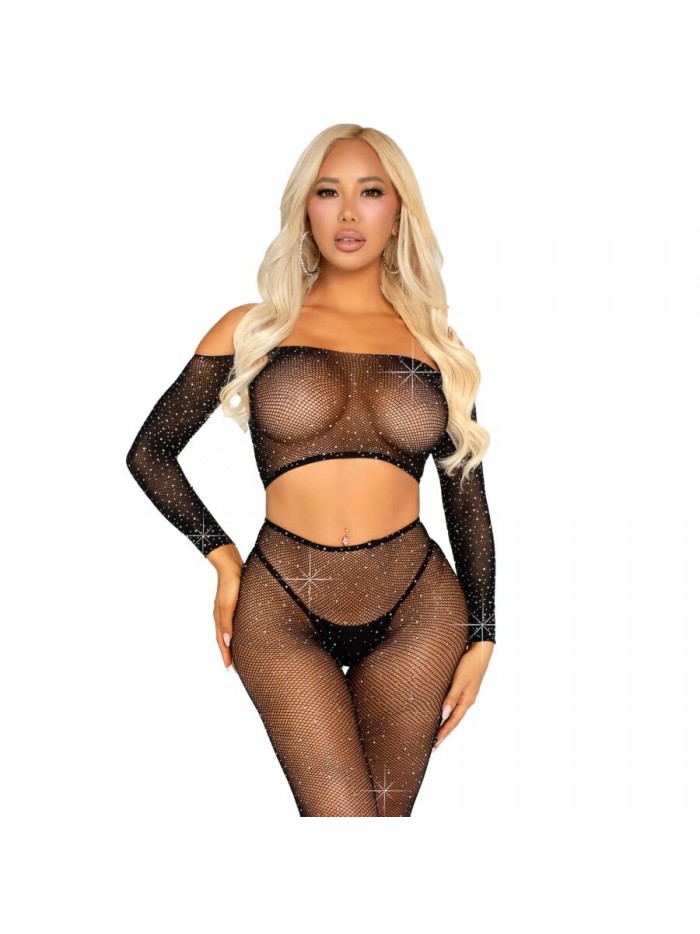 LEG AVENUE - TOP CROP E LEGGING DE REDE COM STRINHOS PRETO