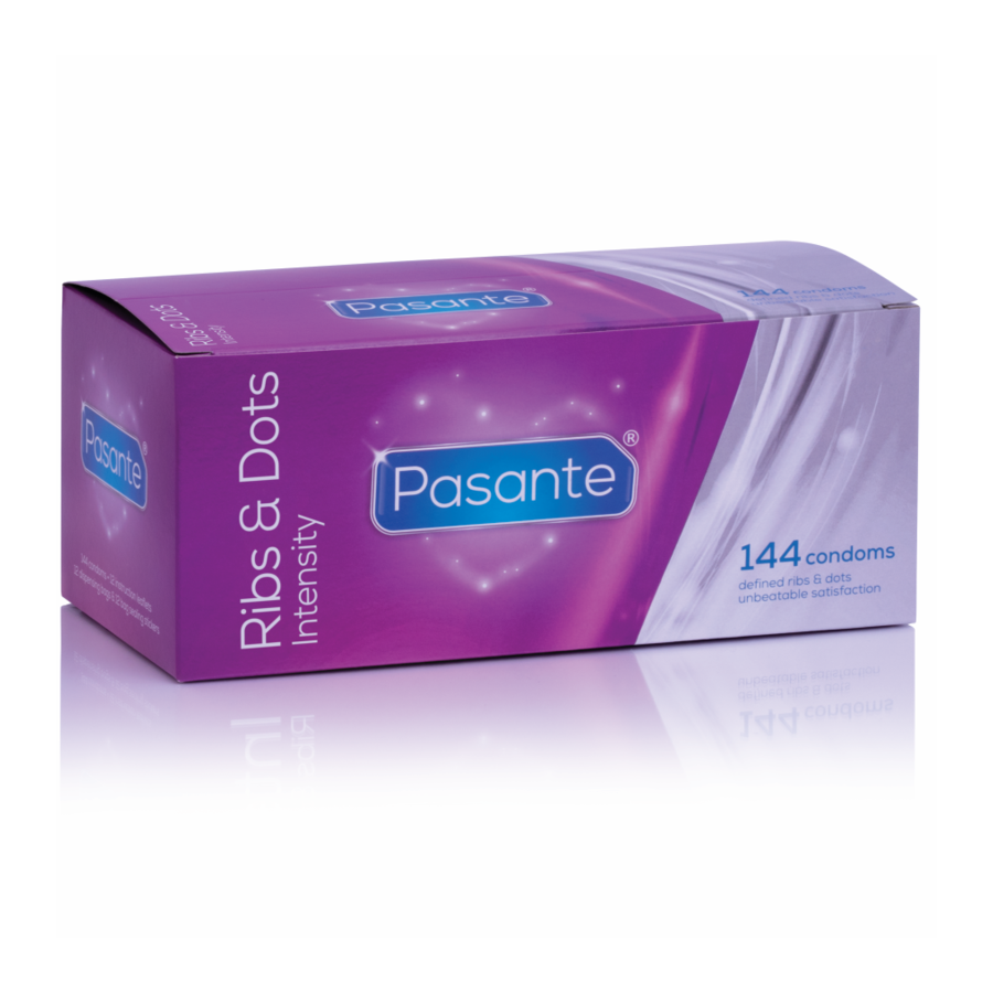 Os preservativos Pasante Ribs Dots Intensity são preservativos cônicos e texturizados com nervuras e pontos pronunciados. De cor natural.