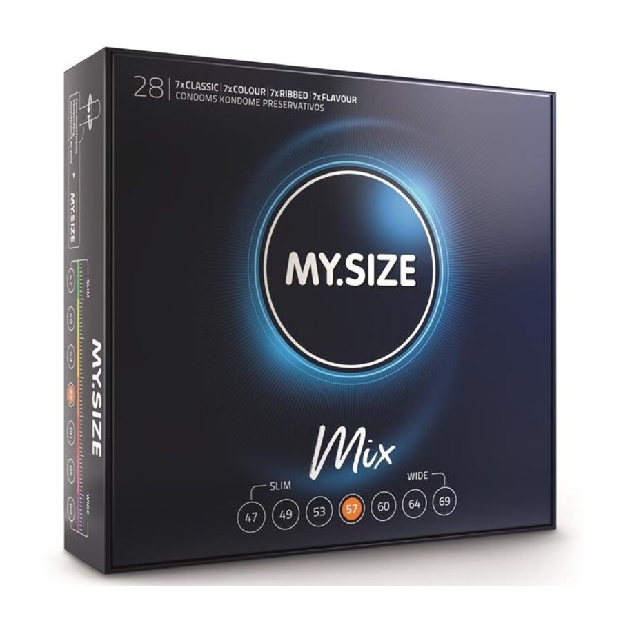 O NEGÓCIO: 28 preservativos MY.SIZE em 4 variações: 7 Clássicos, 7 Canelados, 7 Sabores, 7 Cores. 57 mm. Marcação CE. Em conformidade com a Diretiva da UE 93/42/EEC sobre dispositivos médicos. Disponível em outras larguras nominais. Aplicativo de medição online gratuito incluído.