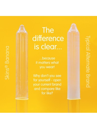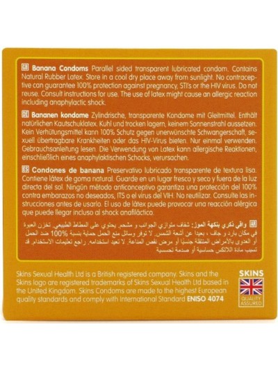Delicie seu paladar com a sensação gustativa das Camisinhas Skins Banana! 4 camisinhas sabor banana embaladas individualmente para facilitar o uso. Tenha uma ótima aparência! Sinta-se bem! Desfrute de um sexo naturalmente melhor com uma camisinha que parece parte de você. Tão transparente e fina que parece uma segunda pele. As camisinhas Skins permitem que você se divirta com segurança sem abrir mão do prazer!