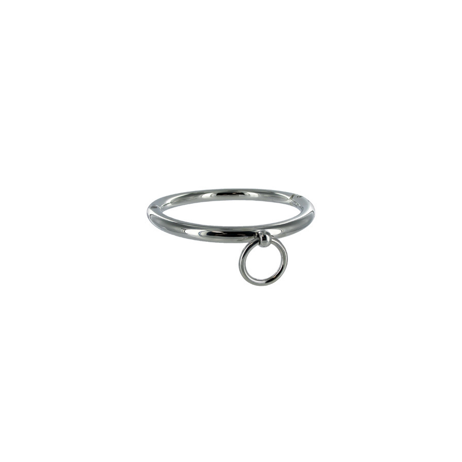 Este colar de metal cromado trava com uma chave Allen incluída. Tem acabamento brilhante e pode ser usado como joia para uso público na rua. A coleira possui um anel de vedação para prender uma corrente de mosquetão, corda ou qualquer outro item de amarração.