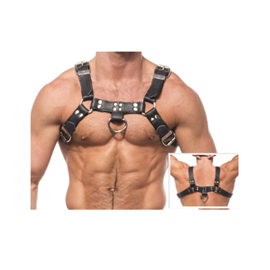 Pratique BDSM com este arnês de couro masculino, totalmente conectado e alças ajustáveis com correntes de metal